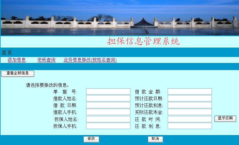 担保资金管理软件特别为中小企业担保公司所设计的,它的功能范围包括四大模块:1.主页(全部信息查询并且可以进行修改)2.业务信息添加(可以把日常所发生的业务添加进去)3.业务信息查询(根据姓名查询到这个人的所有资料)4.业务信息条件查询(可根据从某个 时间段到某个 时间所 发生的业务,还有三个条件资金是否全部还清,部分还清,没有还过),此软件操作简单,容易上手 !操作页面如下图