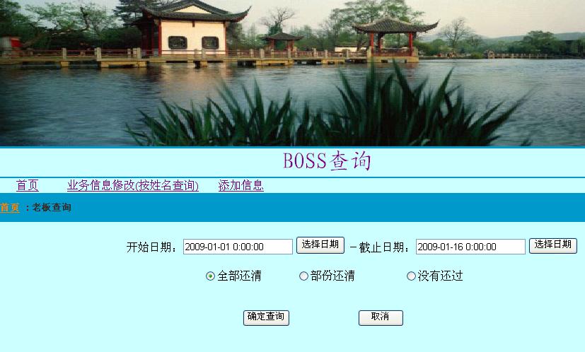 图三:业务信息条件查询(可根据从某个 时间段到某个 时间所 发生的业务,还有三个条件资金是否全部还清,部分还清,没有还过