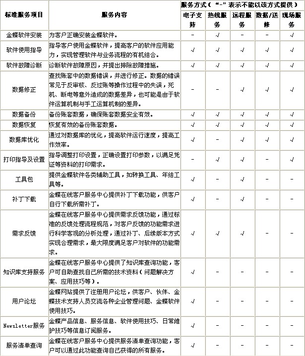 标准维护服务主要解决客户在ERP软件日常应用过程中的常规服务请求,以保障客户软件的正常使用。标准维护服务项目包括:软件安装、使用指导、故障诊断、数据修正;等等。